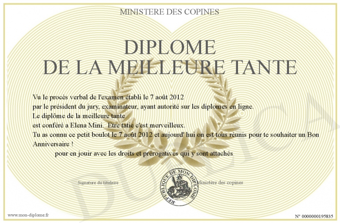 Envoyez par email votre Diplôme de la meilleure tante personalisé