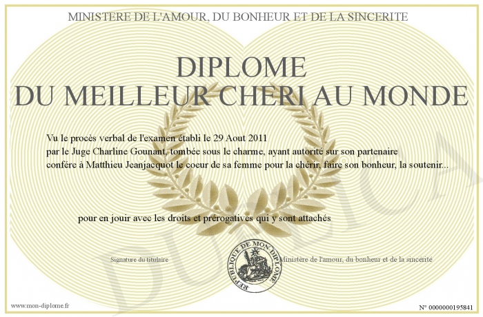 Envoyez par email votre Diplôme du meilleur chéri au monde personalisé