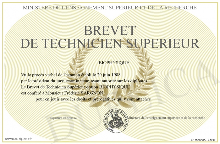Envoyez par email votre Brevet de Technicien Supérieur personalisé