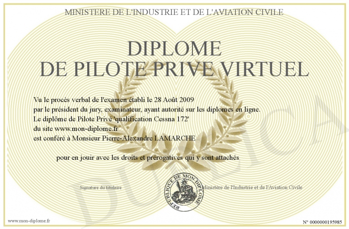 Envoyez par email votre Diplôme de Pilote Privé Virtuel personalisé