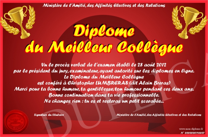 Envoyez par email votre Diplôme du Meilleur Collègue personalisé