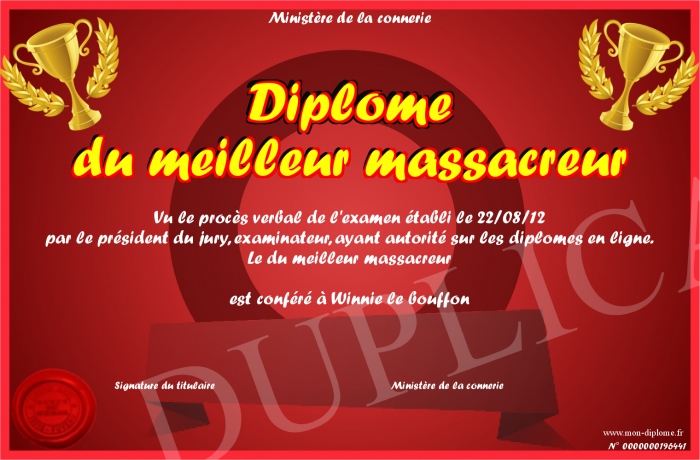 Envoyez par email votre Diplôme du meilleur massacreur personalisé
