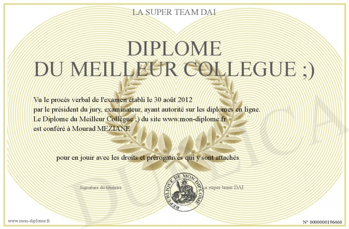 Envoyez par email votre Diplôme du Meilleur Collègue ;) personalisé