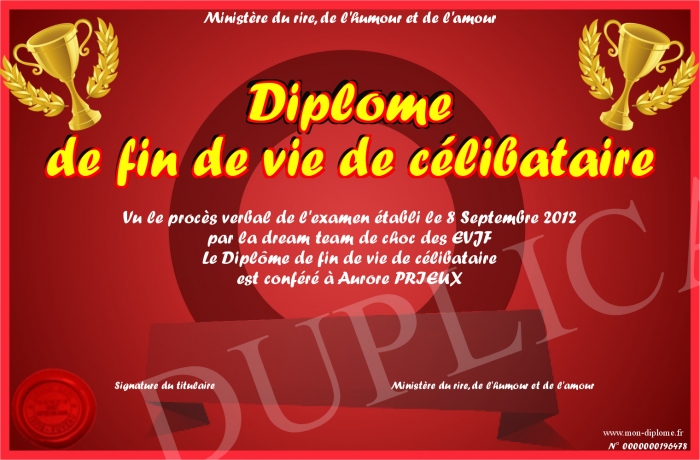 Envoyez par email votre Diplôme de fin de vie de célibataire personalisé