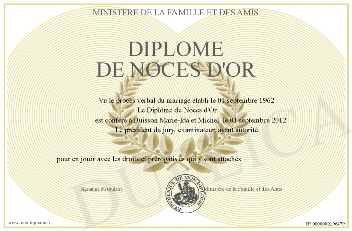 Envoyez par email votre Diplôme de Noces d'Or personalisé