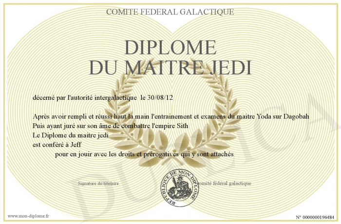 Envoyez par email votre Diplôme du maitre jedi personalisé