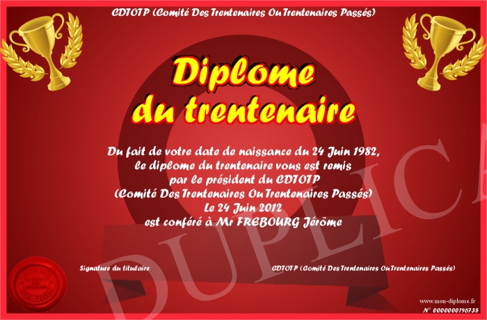 Envoyez par email votre Diplôme du trentenaire personalisé