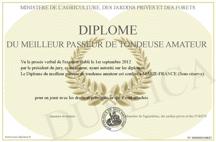 Envoyez par email votre Diplôme du meilleur passeur de tondeuse amateur personalisé