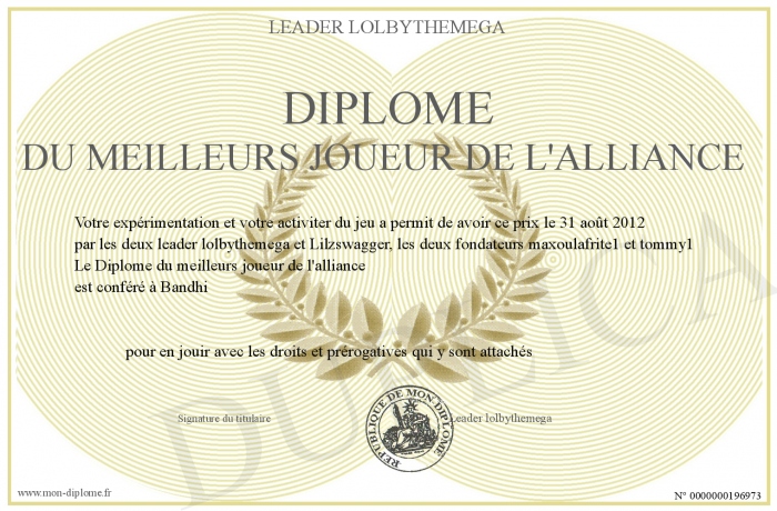 Envoyez par email votre Diplôme du meilleurs joueur de l'alliance personalisé