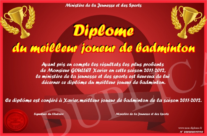 Envoyez par email votre Diplôme du meilleur joueur de badminton personalisé