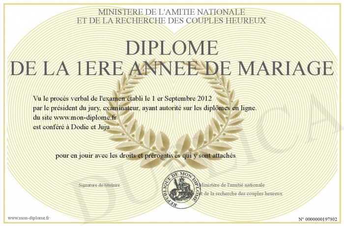 Envoyez par email votre Diplôme de la 1ère année de mariage personalisé
