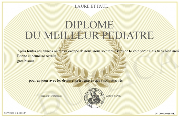Envoyez par email votre Diplôme du meilleur Pédiatre personalisé