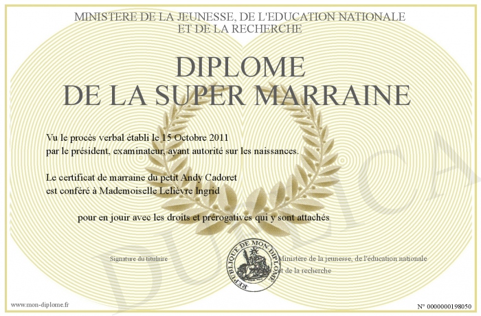 Envoyez par email votre Diplôme de la super marraine personalisé