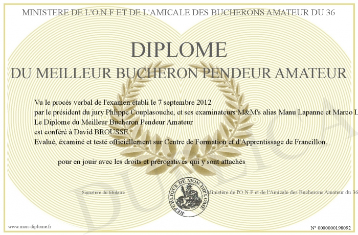 Envoyez par email votre Diplôme du Meilleur Bucheron Pendeur Amateur personalisé