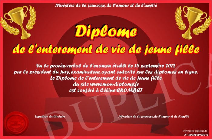 Envoyez par email votre Diplôme de l'enterement de vie de jeune fille personalisé