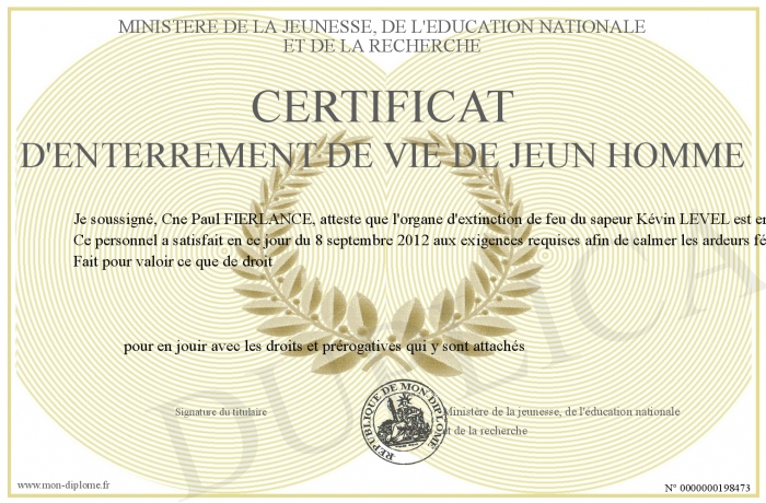 Envoyez par email votre certificat d'enterrement de vie de jeun homme personalisé