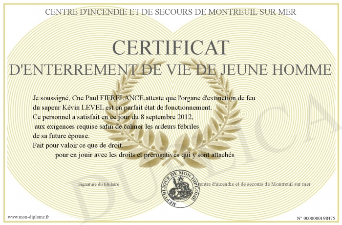 Envoyez par email votre certificat d'enterrement de vie de jeune homme personalisé