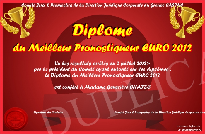Envoyez par email votre Diplôme du Meilleur Pronostiqueur EURO 2012 personalisé