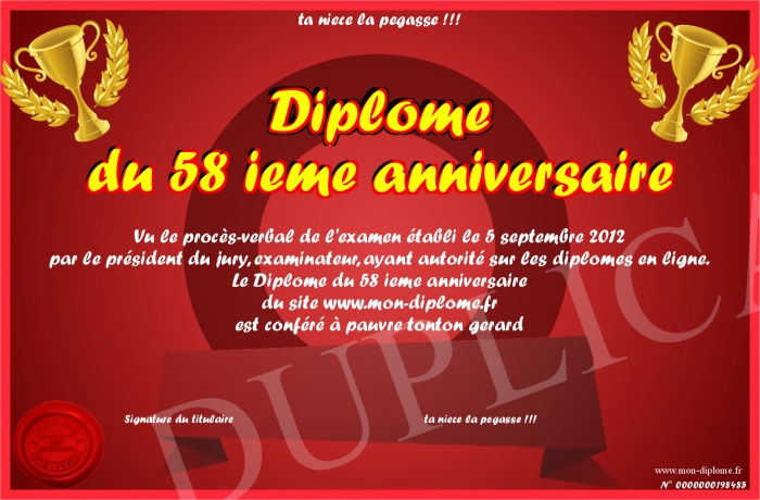 Envoyez par email votre Diplôme du 58 ieme anniversaire personalisé