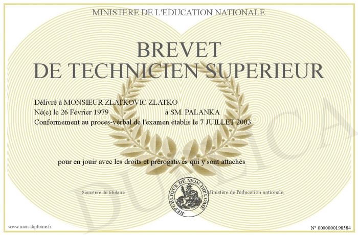 Envoyez par email votre BREVET DE TECHNICIEN SUPERIEUR personalisé