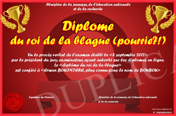 Envoyez par email votre Diplôme du roi de la blague (pourrie?!) personalisé