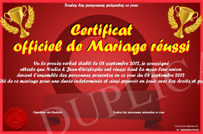 Envoyez par email votre Certificat officiel de Mariage réussi personalisé