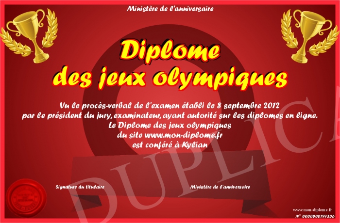 Envoyez par email votre Diplôme des jeux olympiques personalisé