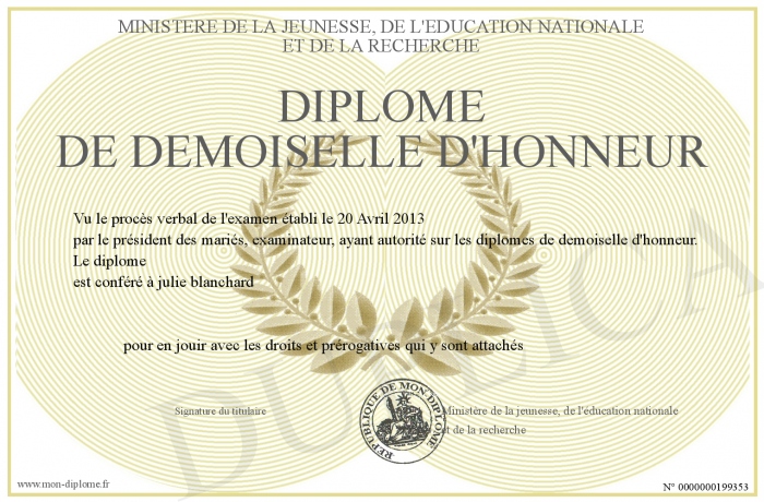 Envoyez par email votre diplome de demoiselle d'honneur personalisé