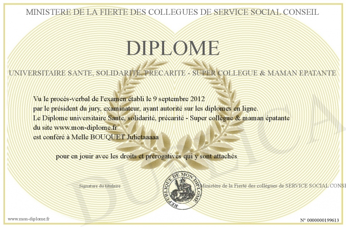 Envoyez par email votre Diplôme universitaire Sante, solidarité, précarité - Super collègue & maman épatante personalisé