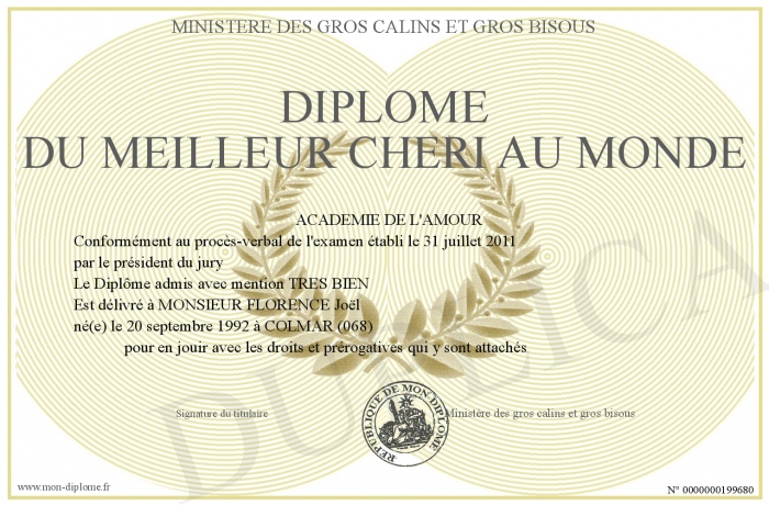 Envoyez par email votre diplome du meilleur chéri au monde personalisé