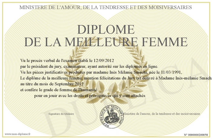 Envoyez par email votre Diplôme de la meilleure femme personalisé