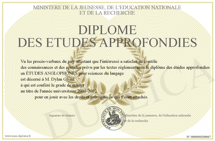 Envoyez par email votre Diplôme des études approfondies personalisé