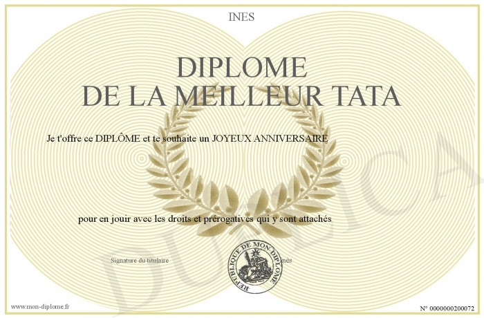Envoyez par email votre Diplôme de la meilleur tata personalisé