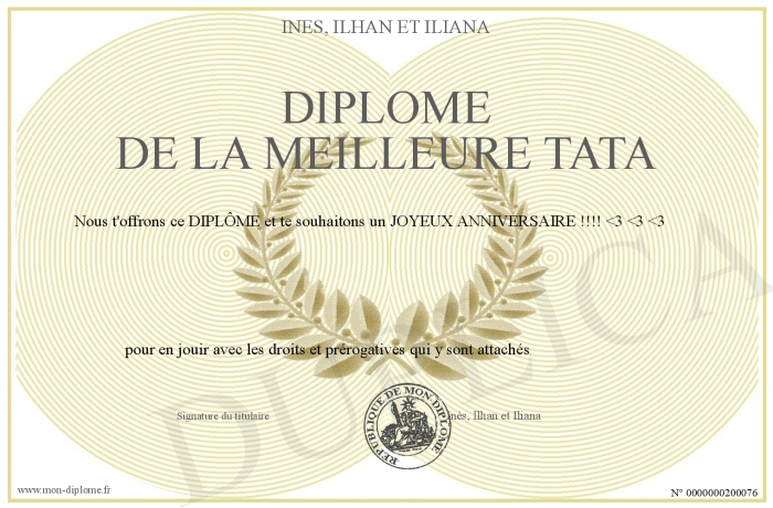 Envoyez par email votre Diplôme de la meilleure tata personalisé