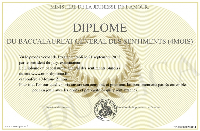 Envoyez par email votre Diplôme du baccalaureat général des sentiments (4mois) personalisé