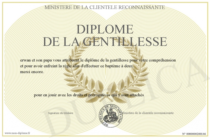 Envoyez par email votre Diplôme de la gentillesse personalisé
