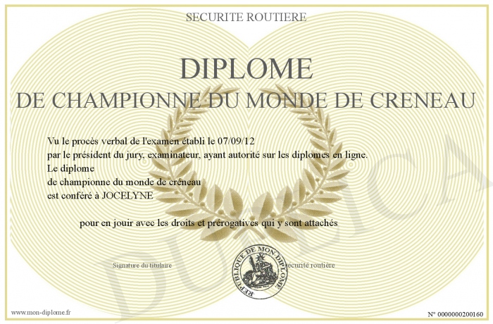 Envoyez par email votre Diplôme de championne du monde de créneau personalisé