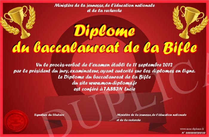 Envoyez par email votre Diplôme du baccalaureat de la Bifle personalisé