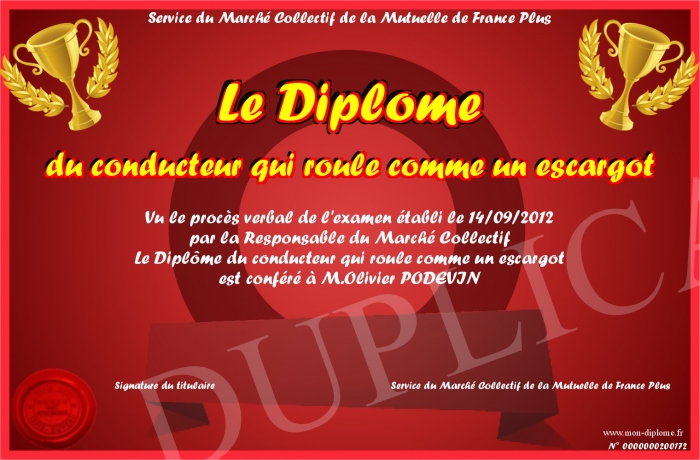 Envoyez par email votre Le Diplôme du conducteur qui roule comme un escargot personalisé