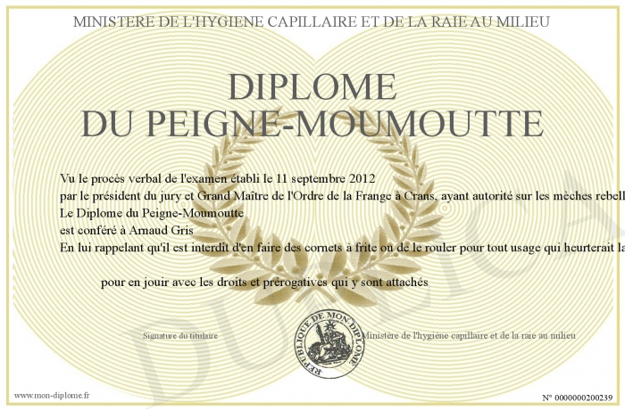 Envoyez par email votre Diplôme du Peigne-Moumoutte personalisé