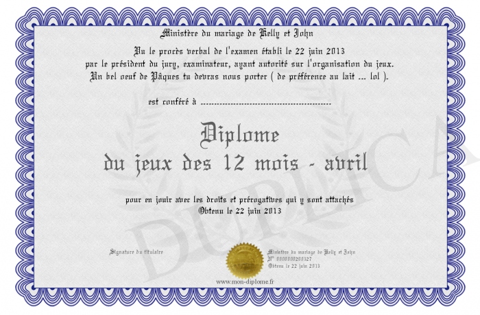Envoyez par email votre Diplôme du jeux des 12 mois - avril personalisé