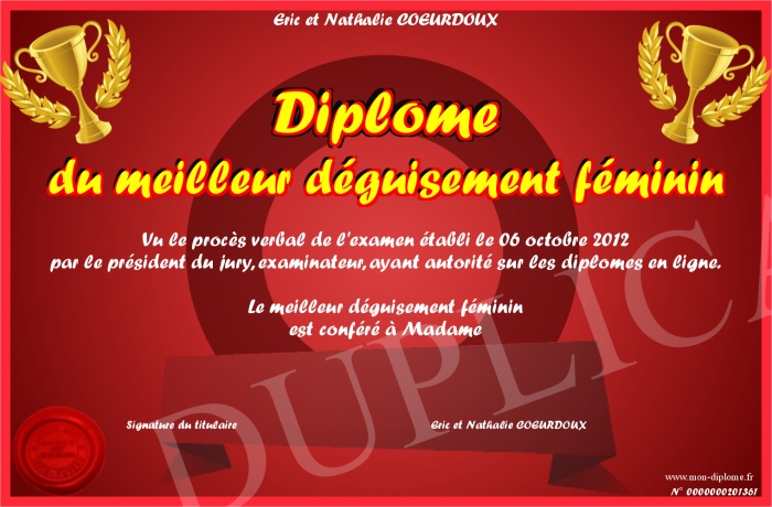 Envoyez par email votre Diplôme du meilleur déguisement féminin personalisé