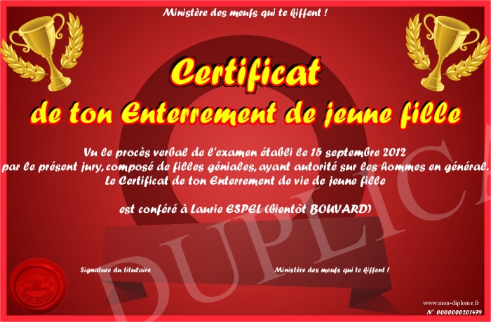 Envoyez par email votre Certificat de ton Enterrement de jeune fille personalisé