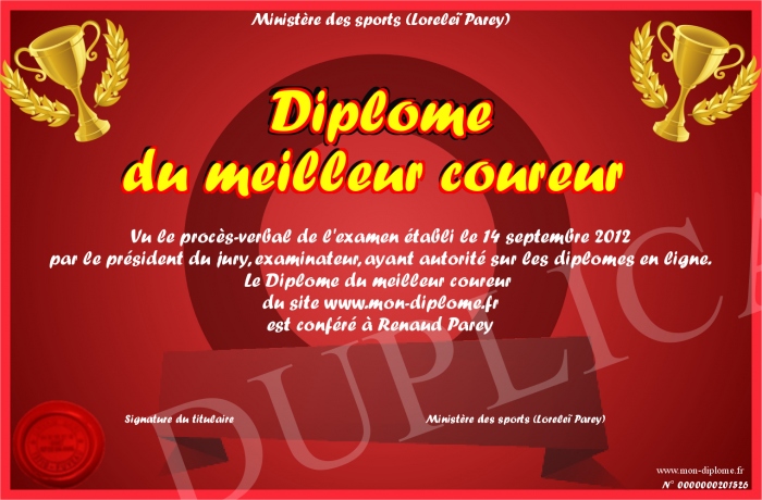 Envoyez par email votre Diplôme du meilleur coureur personalisé