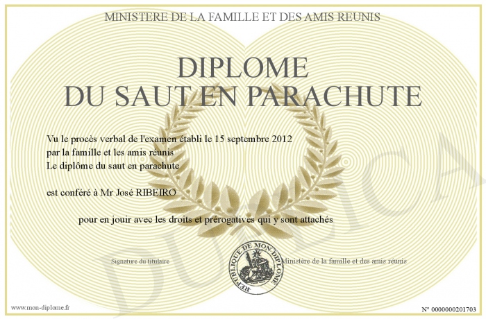 Envoyez par email votre Diplôme du saut en parachute personalisé