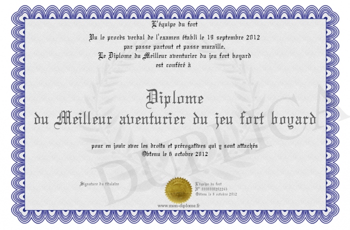 Envoyez par email votre Diplôme du Meilleur aventurier du jeu fort boyard personalisé