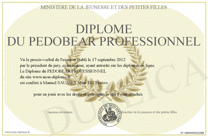 Envoyez par email votre Diplôme du PEDOBEAR PROFESSIONNEL personalisé