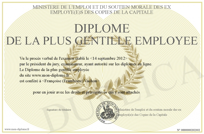 Envoyez par email votre Diplôme de la plus gentille employée personalisé