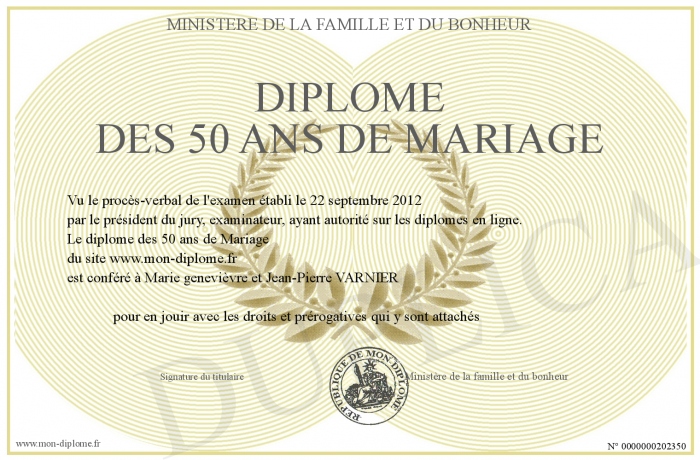 Envoyez par email votre diplome des 50 ans de Mariage personalisé