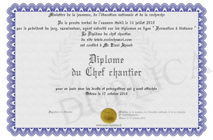 Envoyez par email votre Diplôme du Chef chantier personalisé